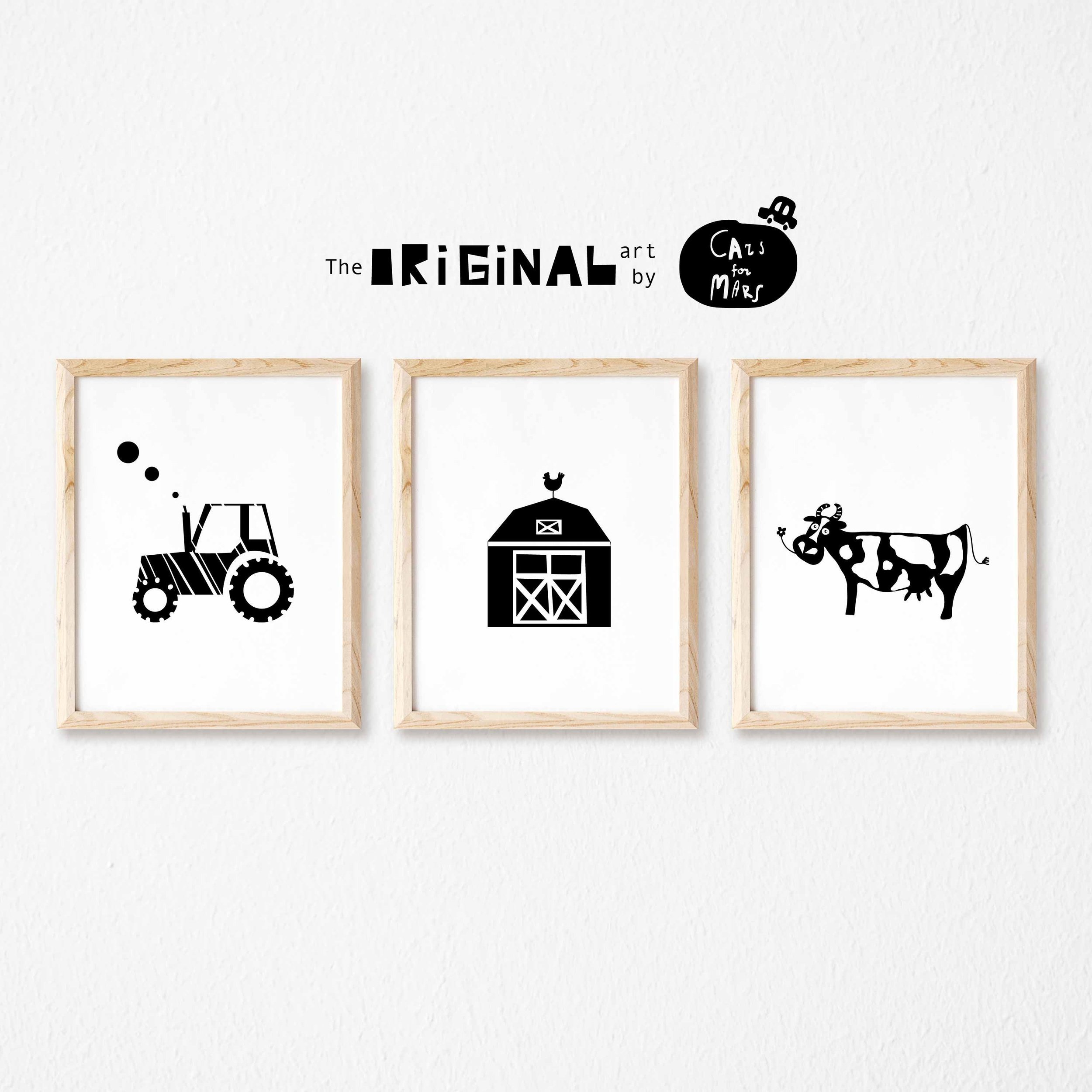 Farm Themed Set of 3 Nursery Prints in Black and White For Toddler Boy Room Decor, Instant Download